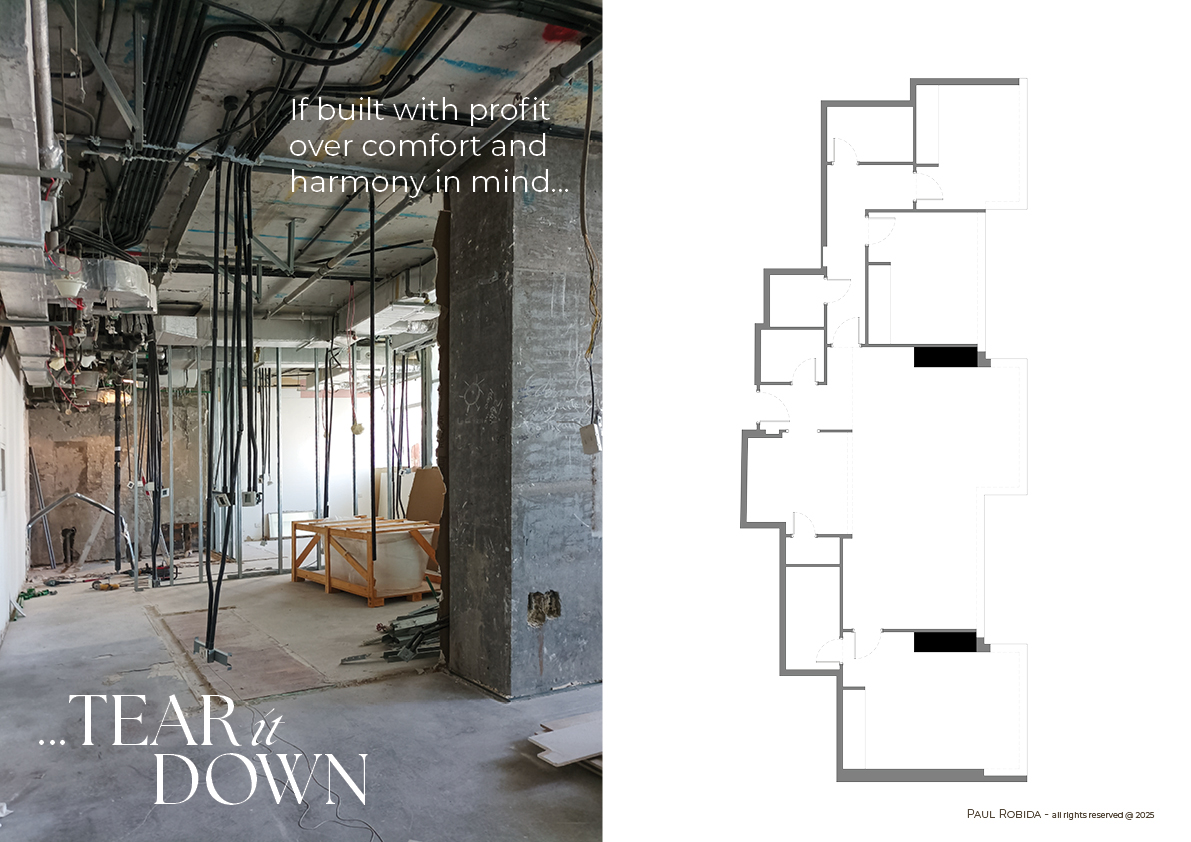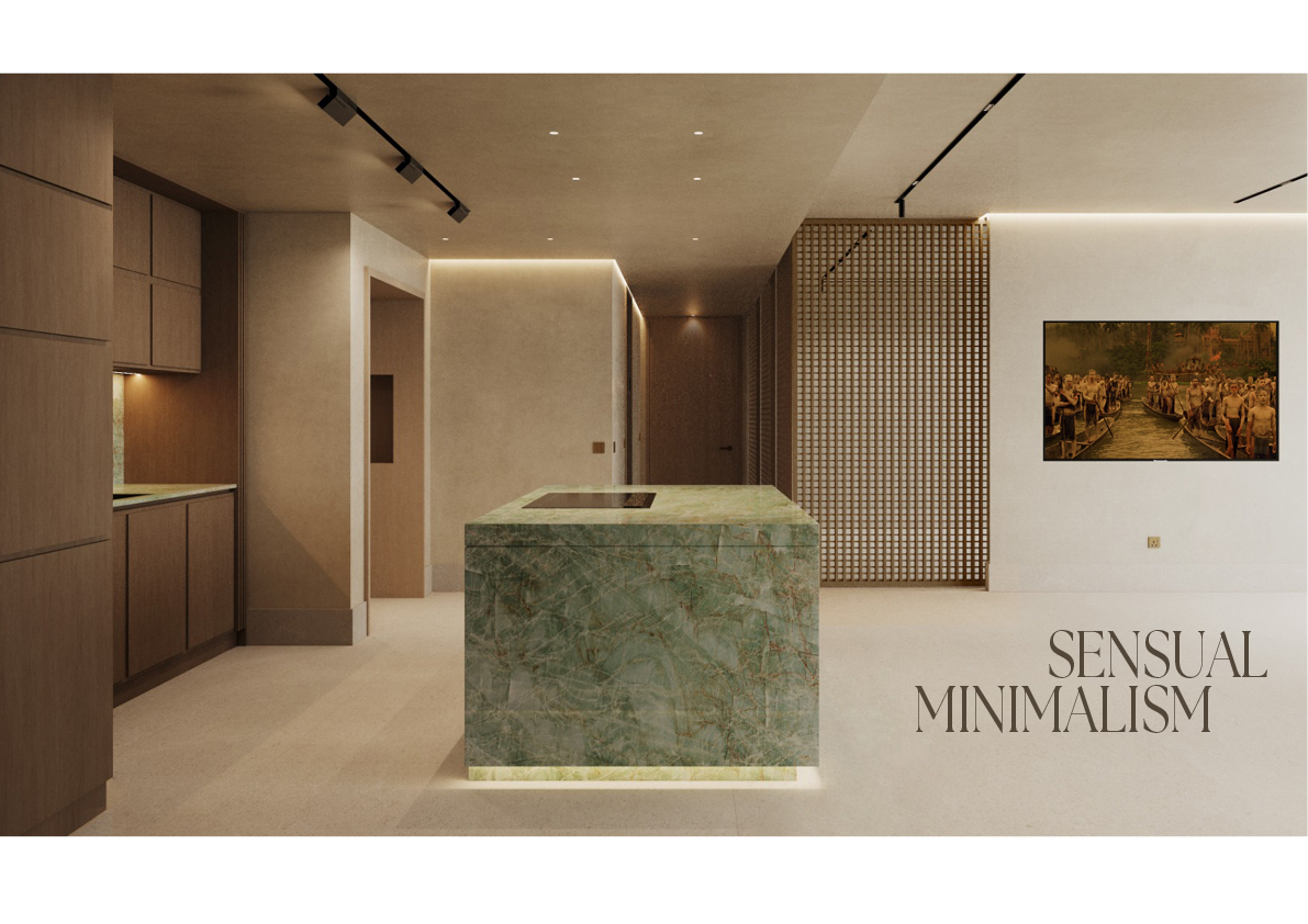 Transforming a congested three bedrooms highrise flat in Dubai financial center, by re-aligning the circulations, introducing sliding perforated wooden doors, offering spatial flexibility and a playful use of lights and shadows.